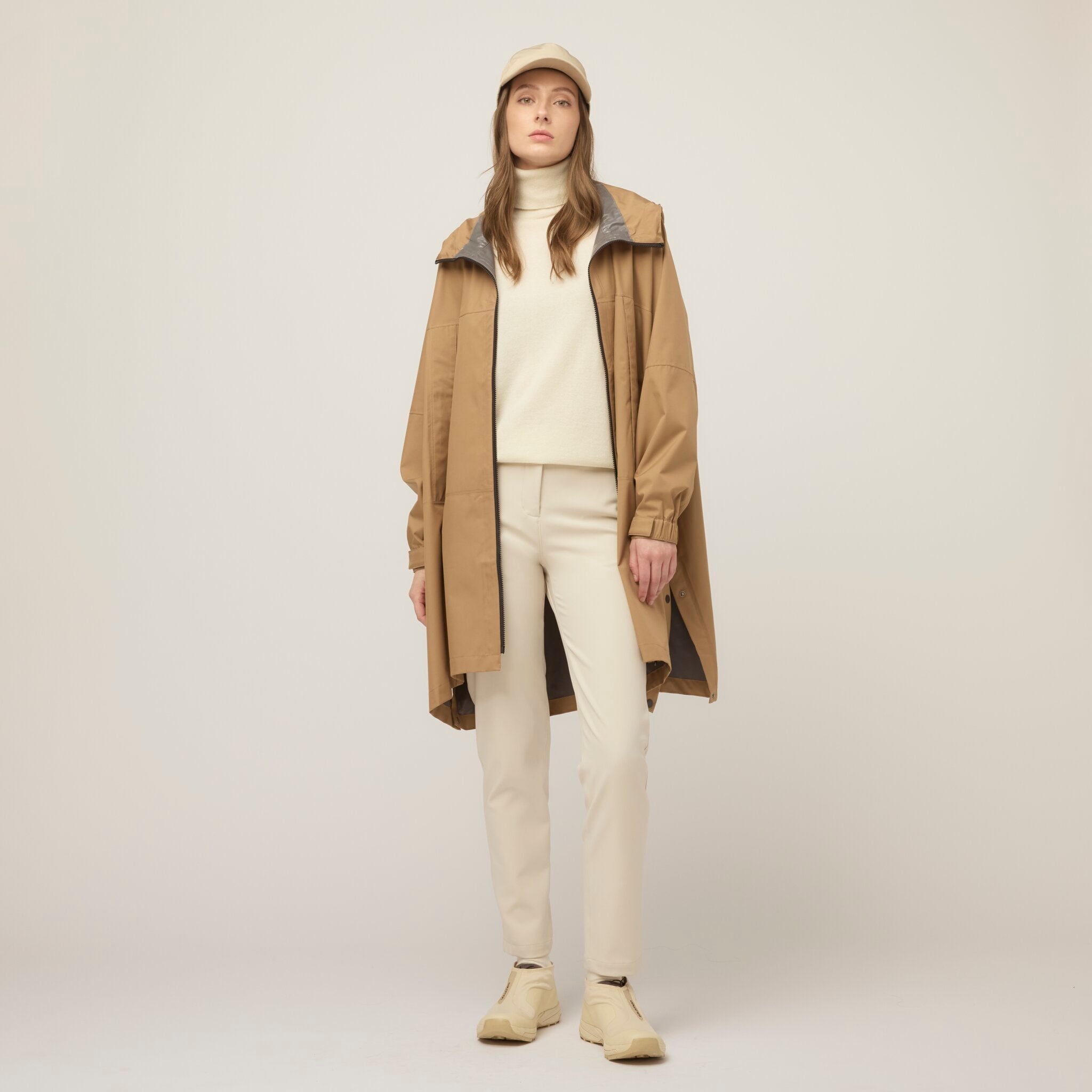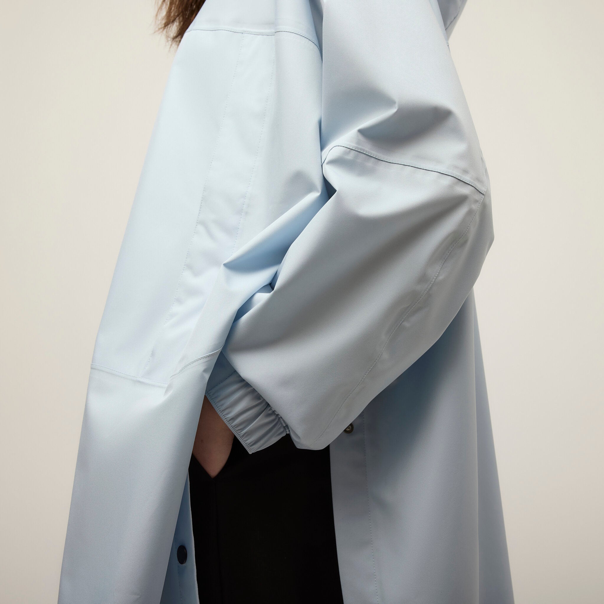 Flip the hood onto the upper chest of the jacket so it lays flat. Fold the arms over each other on the jacket's torso. Folding your raincoat poncho into a square shape helps it fit better into the square-shaped pocket.